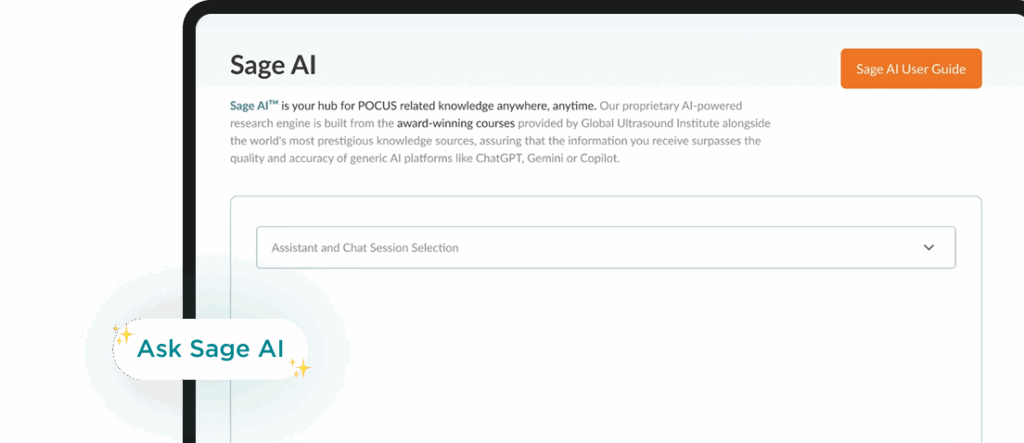 Sage AI™ is not just another chatbot. It’s a clinical ultrasound assistant trained on GUSI’s trusted POCUS content and global expertise. Whether you’re in training or on the floor, Sage AI™ helps you move faster, think smarter, and improve care.