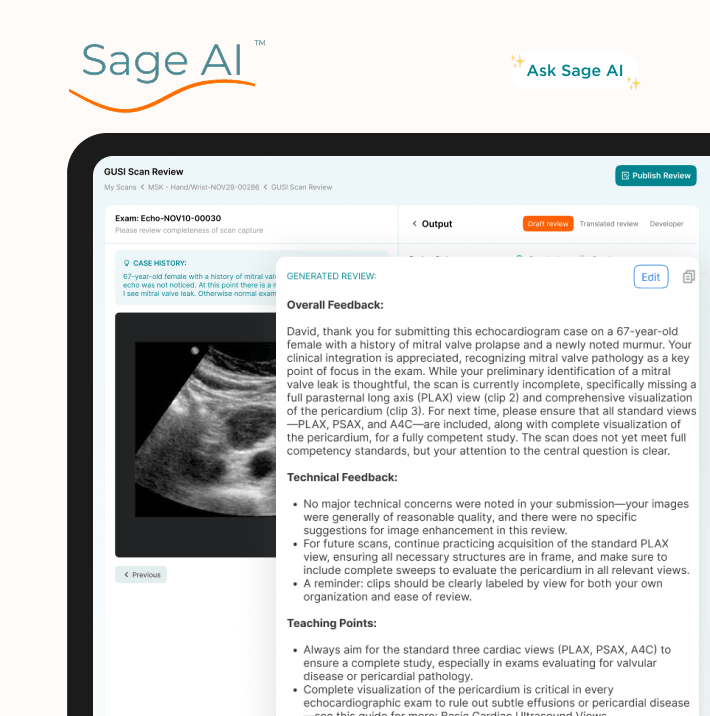 Sage AI automatically reviews your uploaded scans for image quality, proper anatomy labeling, and technical issues. You’ll receive instant feedback with suggestions for improvement, helping you learn proper technique with every scan.
