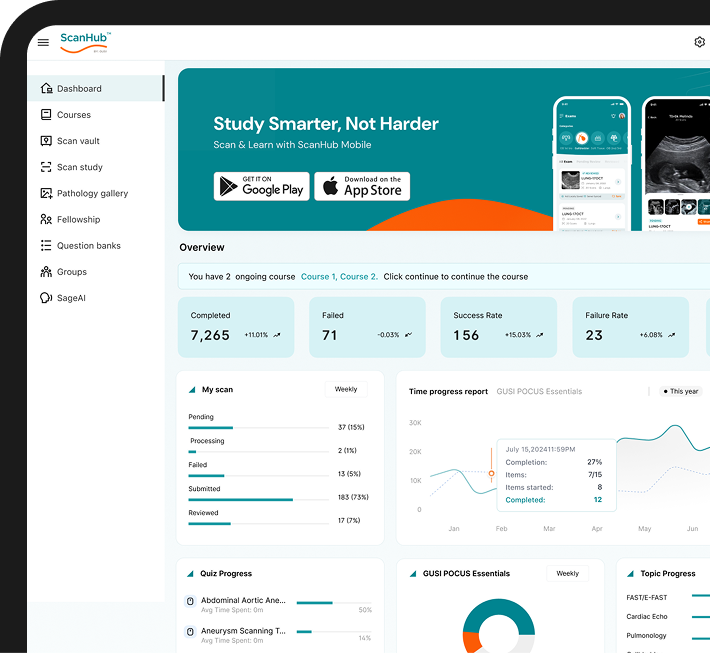 ScanHub provides detailed analytics on your scanning technique, learning milestones, and competency development. Build a comprehensive portfolio that documents your POCUS journey and meets credentialing requirements.